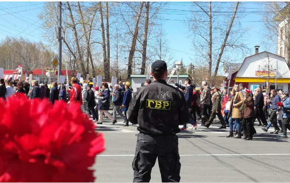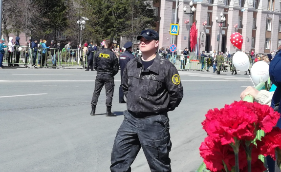 Сотрудники ГБР “Барс” обеспечивают безопасность томичей во время праздничного шествия у Лагерного сада.